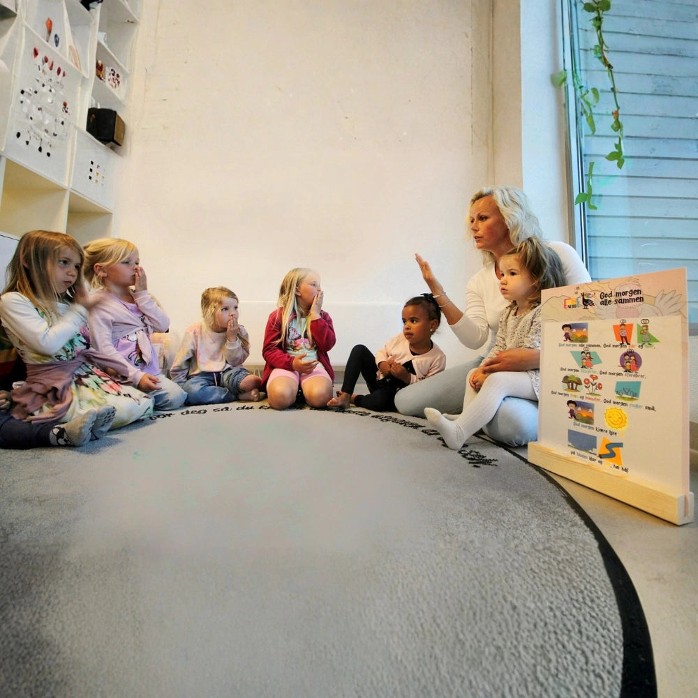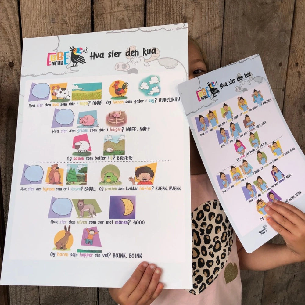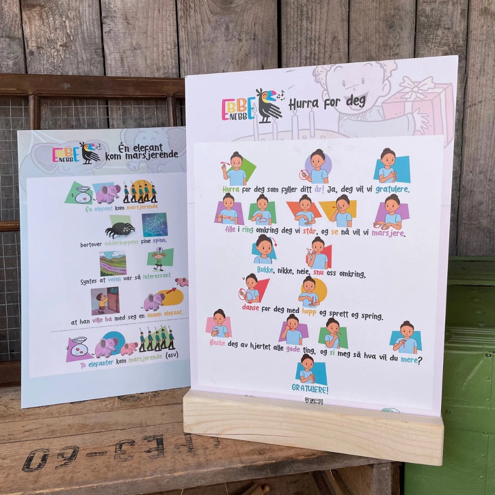15 sangkort med håndtegn på én side og symboler på den andre slik at barna gis flere hint om innholdet i sangen. QR-koden nederst på hvert sangkort tar deg direkte til en videosnutt som viser utførelse av tegnene.